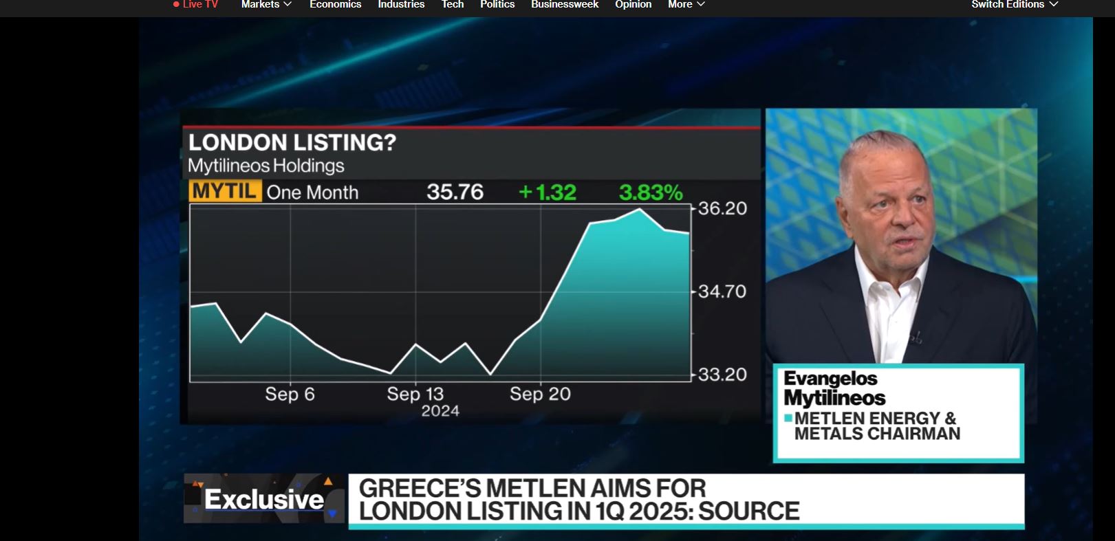 Αίτηση πριν το τέλος του 2024 για εισαγωγή στο LSE δρομολογεί η METLEN Energy & Metals όπως ανέφερε ο Ευάγγελος Μυτιληναίος, Chairman & CEO του ομίλου στο Bloomberg TV και, συγκεκριμένα, στην εκπομπή The Pulse με τη δημοσιογράφο Francine Lacqua.