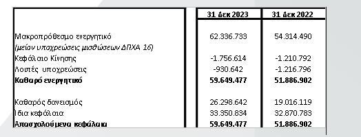 Ο καθαρός δανεισμός του ομίλου αυξήθηκε κατά 7,3 εκ. ευρώ και ανήλθε στα 26,3 εκ. ευρώ στις 31.12.2023. Οι θετικές λειτουργικές χρηματοροές του ομίλου καθώς και οι υφιστάμενες πιστωτικές γραμμές του ομίλου χρηματοδότησαν την εξαγορά των μετοχών της μειοψηφίας της θυγατρικής Λάιον Ρένταλ (7,7 εκ. ευρώ) και τις επενδύσεις στον στόλο αυτοκινήτων της Sixt κρατώντας τον δείκτη Net Debt/EBITDA στο 0.9 για το 2023.