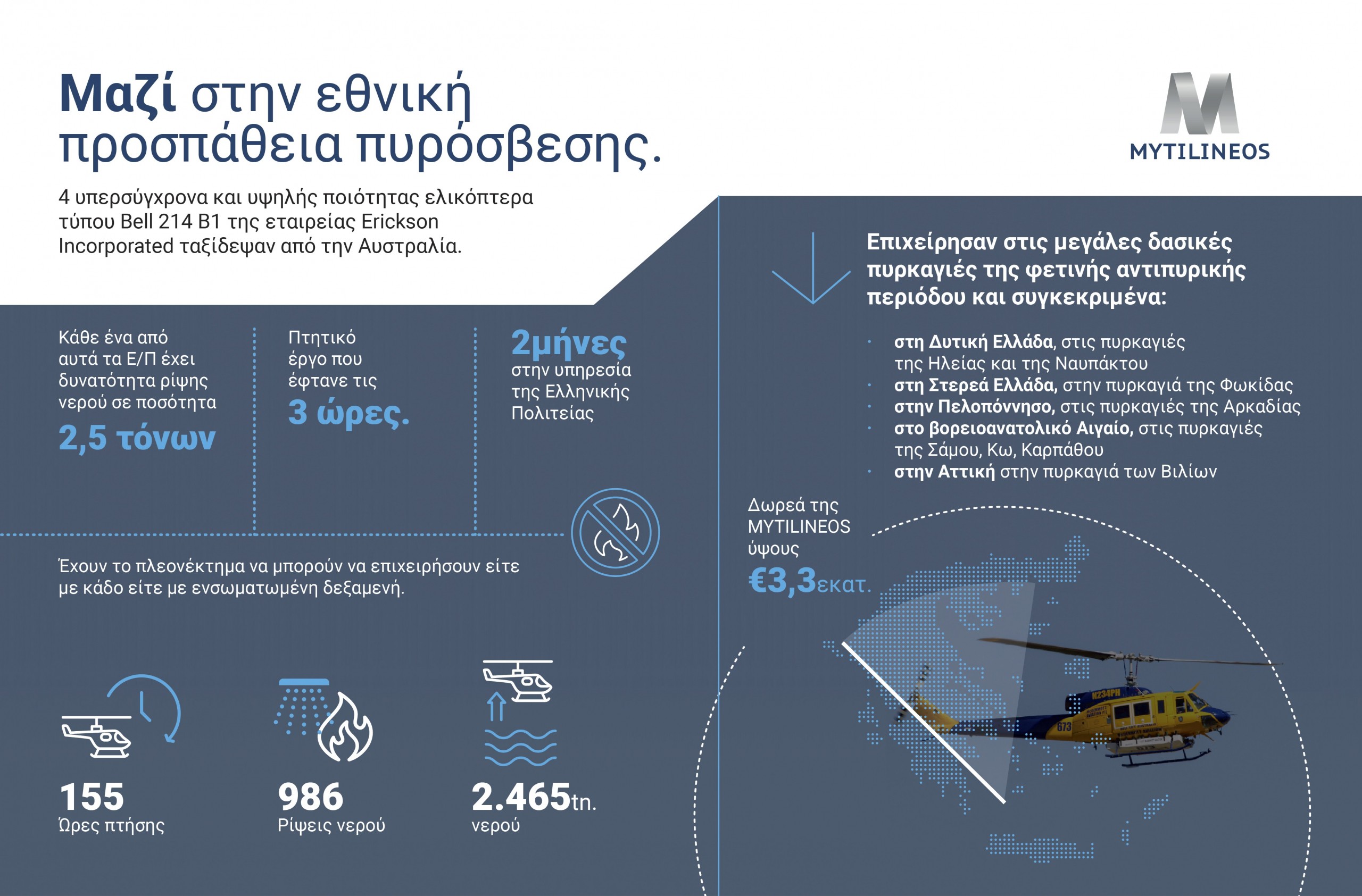 Αναχώρησαν από την Ελλάδα τα τέσσερα ελικόπτερα που χορήγησε και παραχώρησε η εταιρεία MYTILINEOS( δωρεά ύψους 3,3 εκατομμυρίων ευρώ) στον κρατικό μηχανισμό για τις ανάγκες της Πυροσβεστικής Υπηρεσίας. Τα ελικόπτερα τύπου BELL 214 BI της εταιρείας Erickson Incorporated που ταξίδεψαν από την Αυστραλία πλήρως στελεχωμένα τόσο με ιπτάμενο προσωπικό, όσο και με προσωπικό υποστήριξης που αποτελούνταν από περισσότερους από 20 πιλότους, μηχανικούς και μεταφραστές, ένωσαν τις δυνάμεις τους με τους Έλληνες πυροσβέστες στο πλαίσιο της εθνικής προσπάθειας για την κατάσβεση των ενεργών μετώπων των πυρκαγιών που έπληξαν τη χώρα.