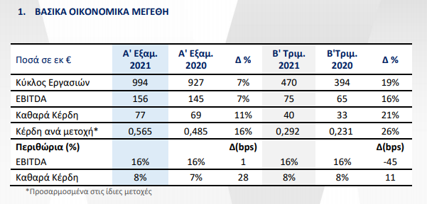 - O Κύκλος Εργασιών και τα Κέρδη προ Φόρων, Τόκων και Αποσβέσεων (EBITDA) ανήλθαν σε €994 εκατ. και €156 εκατ. αντίστοιχα για το Α΄ εξάμηνο του 2021, επίσης αυξημένα κατά 7%. Αντίστοιχα με τα καθαρά κέρδη, αν εξαιρεθούν οι επιδράσεις των μη επαναλαμβανόμενων παραγόντων (one off) η αύξηση του EBITDA θα ανέρχονταν σε +29% στα €161 εκατ. έναντι €125 εκατ. το Α’ εξάμηνο του 2020.