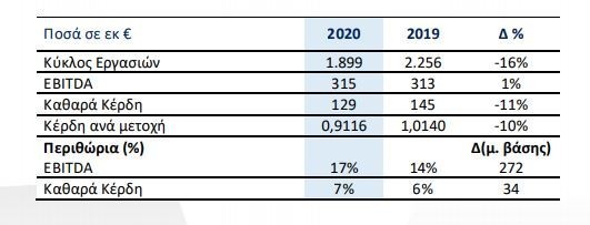 Πιο συγκεκριμένα, η λειτουργική κερδοφορία (ΕΒΙΤDA) ανήλθε σε €315 εκατ. παραμένοντας αμετάβλητη σε σύγκριση με το 2019.