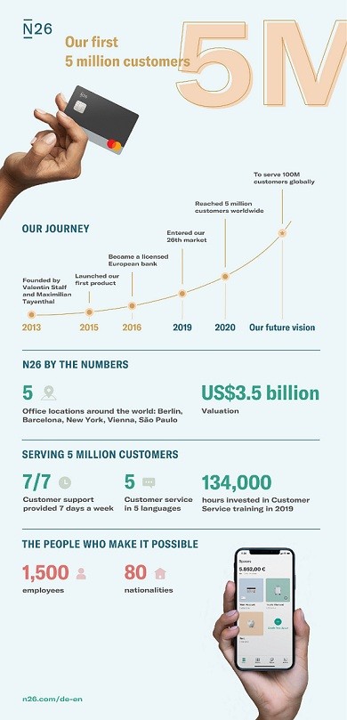 Η παγκόσμια ψηφιακή τράπεζα N26 ανακοίνωσε σήμερα ότι ξεπέρασε το φράγμα των 5 εκατομμυρίων πελατών, πέντε χρόνια από το λανσάρισμα του επαναστατικού mobile-only λογαριασμού της, στις 26 Ιανουαρίου 2015.