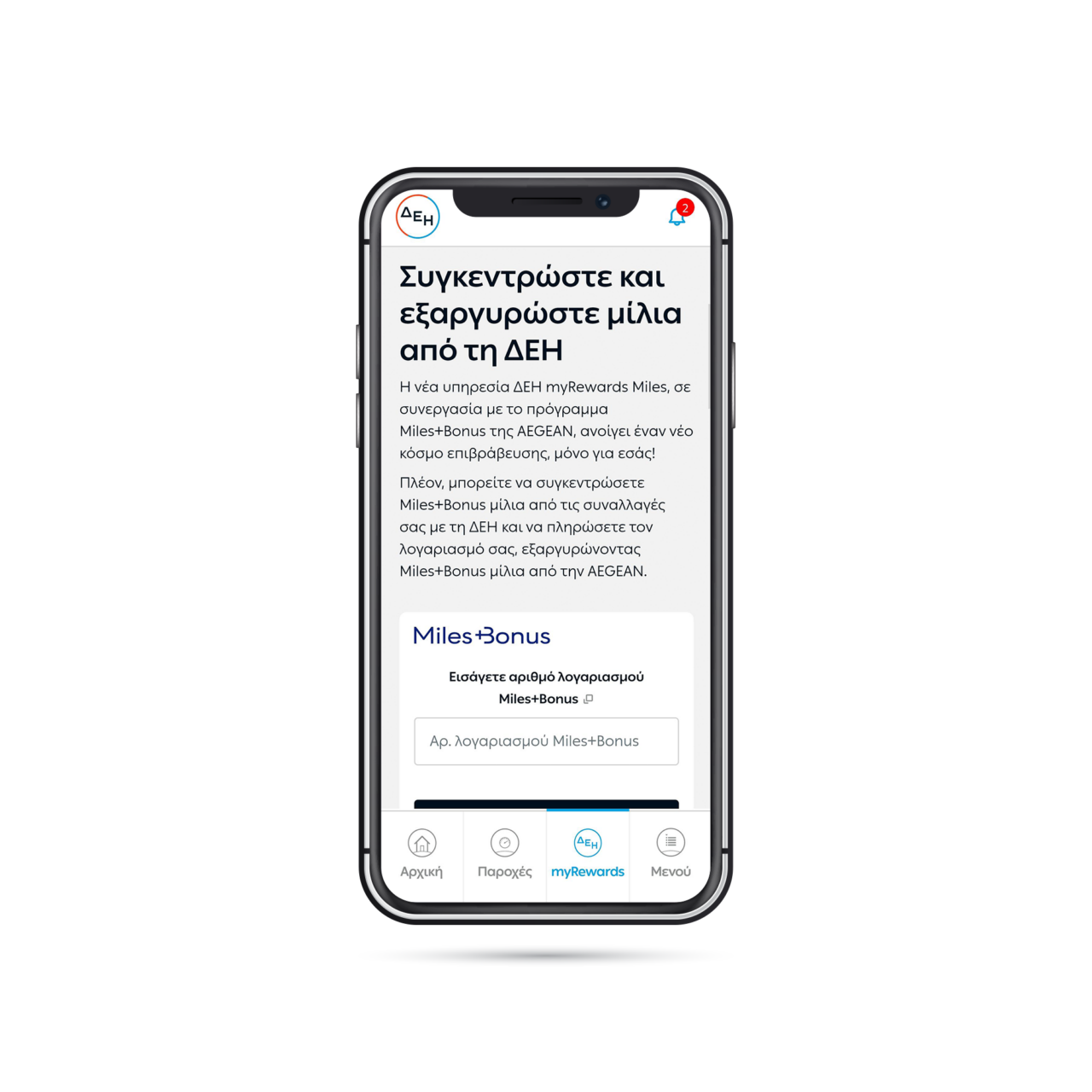 Νέα υπηρεσία επιβράβευσης ΔΕΗ myRewards Miles από την ΔΕΗ σε συνεργασία με την AEGEAN, η οποία ανοίγει έναν νέο κόσμο συλλογής και εξαργύρωσης Miles+Bonus μιλίων για τους πελάτες των δυο εταιρειών. Το ΔΕΗ myRewards Miles είναι βασισμένο στην πελατοκεντρική στρατηγική της ΔΕΗ που έχει τις ανάγκες και τις επιθυμίες του πελάτη στο επίκεντρο, και στις δυνατότητες που προφέρει το μεγαλύτερο πρόγραμμα επιβράβευσης στον αεροπορικό κλάδο στην Ελλάδα.