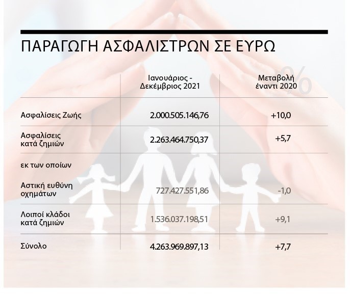 Σύμφωνα με την ετήσια έκθεση της Ενωσης Ασφαλιστικών Εταιρειών Ελλάδος (ΕΑΕΕ), η συνολική παραγωγή των εταιρειών το 2021 αυξήθηκε κατά 7,7% ξεπερνώντας και τα επίπεδα του 2019 και φτάνοντας στα 4,3 δισ. ευρώ! Εξ αυτών τα 3,3 δισ. ευρώ περίπου παρήχθησαν από τις 6 μεγαλύτερες εταιρείες του κλάδου, όπως αυτές πλέον έχουν διαμορφωθεί. Ο κλάδος ζωής αυξήθηκε κατά 10% σε σχέση με το 2020 ξεπερνώντας τα 2 δισ. ευρώ, με τις ασφαλίσεις ζωής συνδεδεμένες με επενδύσεις να καλπάζουν στο +57,7% και ο κλάδος γενικών ασφαλίσεων αυξήθηκε κατά 5,7%, φτάνοντας τα 2,26 δισ. ευρώ.