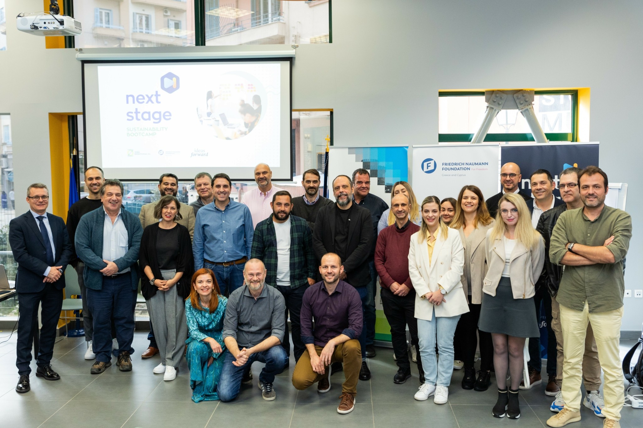 Στην κεντρική φωτογραφία οι συμμετέχοντες στο φετινό Next Stage Sustainability Bootcamp