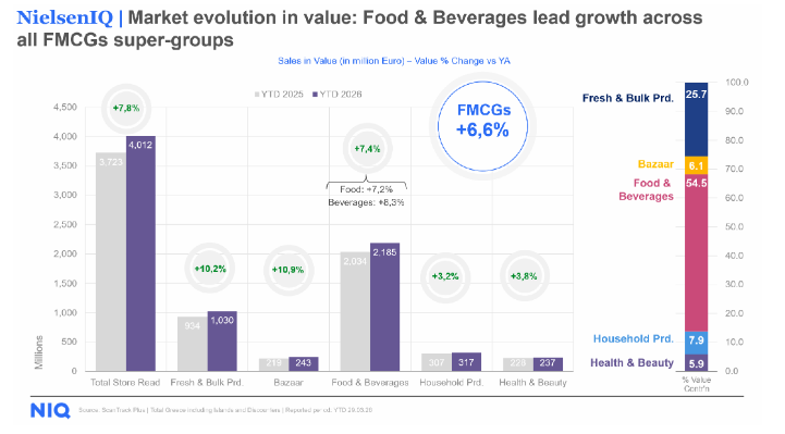 Σύμφωνα με τα πιο πρόσφατα στοιχεία της NielsenIQ για την περίοδο 29 Δεκεμβρίου 2025 – 29 Μαρτίου 2026, η συνολική αγορά των FMCGs στο λιανεμπόριο τροφίμων κατέγραψε αύξηση πωλήσεων σε αξία κατά +6,6%, με την ανάπτυξη να είναι κυρίως καθοδηγούμενη από τη ζήτηση, όπως αποτυπώνεται και στην παράλληλη αύξηση των πωλήσεων σε όγκο (+4,7%).