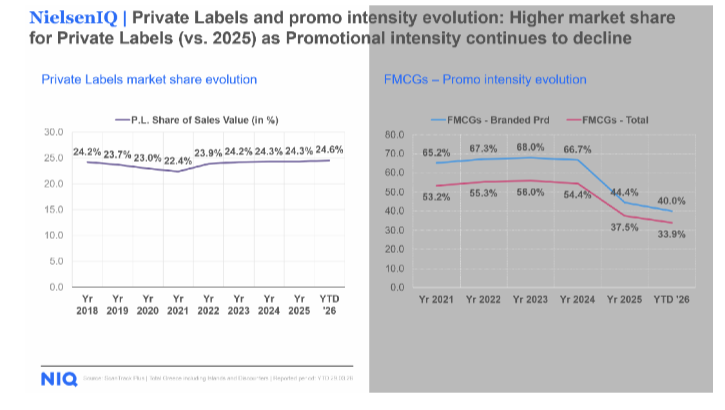 Το α’ τρίμηνο του 2026 χαρακτηρίζεται επίσης από αύξηση του μεριδίου των προϊόντων ιδιωτικής ετικέτας, το οποίο έφτασε στο 24,6% της συνολικής αξίας πωλήσεων, την ώρα που η προωθητική ένταση συνεχίζει να υποχωρεί, φτάνοντας το ιστορικά χαμηλό ποσοστό της τάξης του 40% για τα επώνυμα FMCGs προϊόντα, αποτυπώνοντας την επίδραση του κώδικα δεοντολογίας στις στρατηγικές προώθησεις των προμηθευτών του κλάδου.