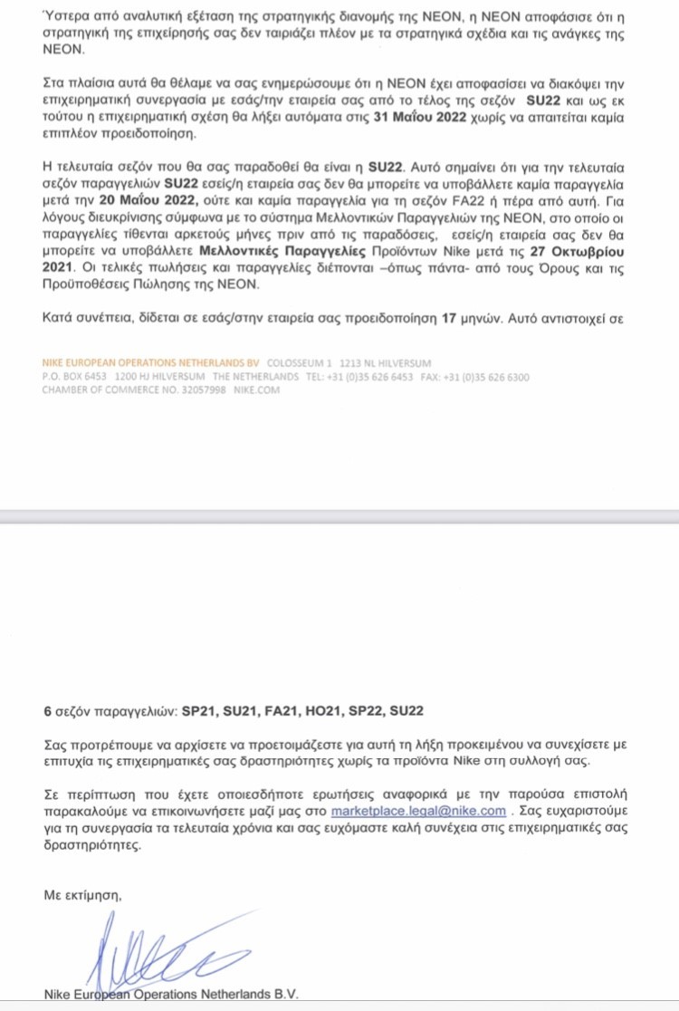Στις 29 Ιανουαρίου έγινε γνωστό πως η Nike, μέσω της Ολλανδικής θυγατρικής της, έβαλε τέλος στην συνεργασία της με περισσότερες από 90 εταιρείες με περίπου 300 καταστήματα πώλησης αθλητικών ειδών στην Ελλάδα. Η επιστολή της Nike European Operation Netherlands που εστάλη στις 90 περίπου εταιρείες με τα καταστήματα αναφέρει ότι «η στρατηγική της επιχείρησής σας δεν ταιριάζει πλέον με τα στρατηγικά σχέδια και τις ανάγκες της ΝΕΟΝ».