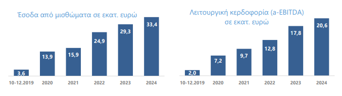Τα έσοδα από μισθώματα για τη χρήση που έληξε την 31 Δεκεμβρίου 2024 ανήλθαν σε 33,4 εκατ. ευρώ, έναντι 29,3 εκατ. ευρώ κατά τη χρήση του 2023, παρουσιάζοντας αύξηση 4,1 εκατ. ευρώ (αύξηση 14%). Η εν λόγω αύξηση είναι απόρροια της ενεργητικής διαχείρισης των ακινήτων της Εταιρείας, η οποία, σε συνδυασμό με την υψηλή ποιότητα των ακινήτων του χαρτοφυλακίου, οδήγησε στη σύναψη νέων μισθωτικών συμβάσεων και στην αντικατάσταση υφιστάμενων συμβάσεων μίσθωσης με νέες συμβάσεις με πιο ευνοϊκούς όρους.