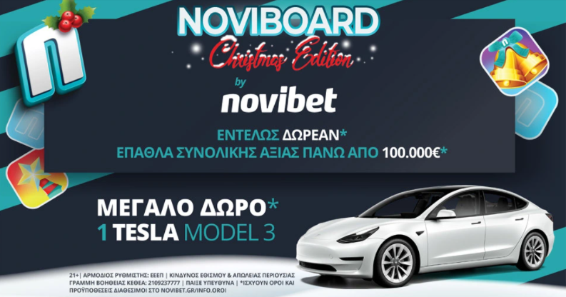 H Novibet, κορυφαία εταιρεία στον κλάδο του online gaming με προϊόντα τελευταίας τεχνολογίας, εμπλουτίζει συνεχώς τις επιλογές ψυχαγωγίας που προσφέρει στην ιδιόκτητη πλατφόρμα της. Φέτος τις γιορτές μας συστήνει το νέο γιορτινό παιχνίδι NoviBoard Christmas Edition, που είναι διαθέσιμο με δωρεάν συμμετοχή, και χαρίζει συνολικά έπαθλα* αξίας έως 100.000€* και μεγάλο δώρο ένα αμάξι TESLA Model 3**!