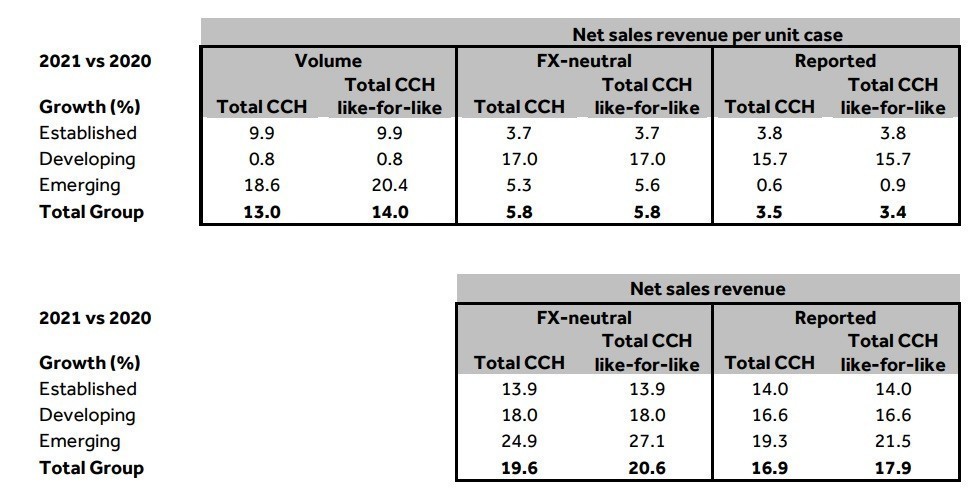 Προς το παρόν, όπως έδειξαν τα οικονομικά αποτελέσματα του 2021, το ισοζύγιο γέρνει υπέρ της Coca Cola HBC κυρίως μέσα απ’ την ανάπτυξη του προϊοντικού χαρτοφυλακίου, ανατιμήσεων αλλά και μίας ιδανικής για την κατανάλωση χρονιάς που ώθησε με εντυπωσιακό ρυθμό τις πωλήσεις, κυρίως στις αναδυόμενες αγορές. Κάπως έτσι υπολογίζεται ότι η αξία των πωλήσεων χωρίς να λαμβάνονται οι αυξομειώσεις των συναλλαγματικών ισοτιμιών αυξήθηκε 25% πέρυσι.