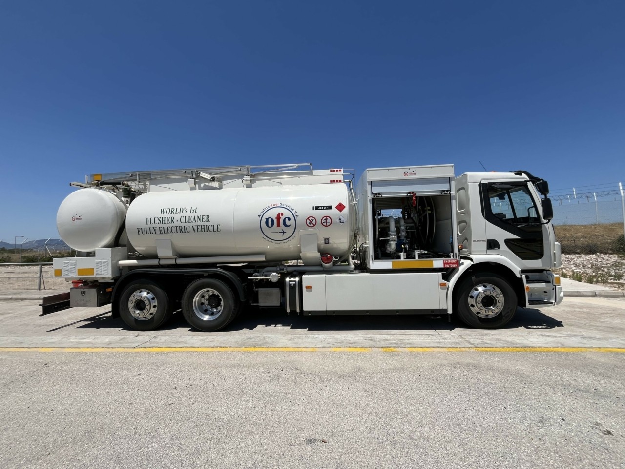 Ο Όμιλος Επιχειρήσεων Σαρακάκη, αποκλειστικός εισαγωγέας και διανομέας της Volvo Trucks στην Ελλάδα και την Κύπρο, παρέδωσε στον Διεθνή Αερολιμένα Αθηνών «Ελευθέριος Βενιζέλος» στην εταιρεία OFC Aviation Fuel Services SA ένα τριαξονικό ηλεκτρικό φορτηγό Volvo FE που συνδυάζει την πρωτοπορία της ηλεκτροκίνησης με την τεχνολογική εξειδίκευση της αεροπορικής υποδομής. Πρόκειται για το πρώτο παγκοσμίως ηλεκτρικό φορτηγό τύπου Flusher/Cleaner, βασισμένο σε πλαίσιο Volvo FE, ειδικά σχεδιασμένο ώστε να εκτελεί δύο κρίσιμες λειτουργίες: την ποιοτική δειγματοληψία του καυσίμου και τον καθαρισμό των αγωγών του συστήματος ανεφοδιασμού των αεροσκαφών.