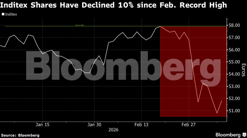 Οι μετοχές της Inditex, οι οποίες είχαν φτάσει σε ιστορικό υψηλό τον Φεβρουάριο, έχουν υποχωρήσει απότομα τις τελευταίες δύο εβδομάδες λόγω της ευρύτερης αναταραχής στις αγορές που σχετίζεται με τον πόλεμο στο Ιράν.
