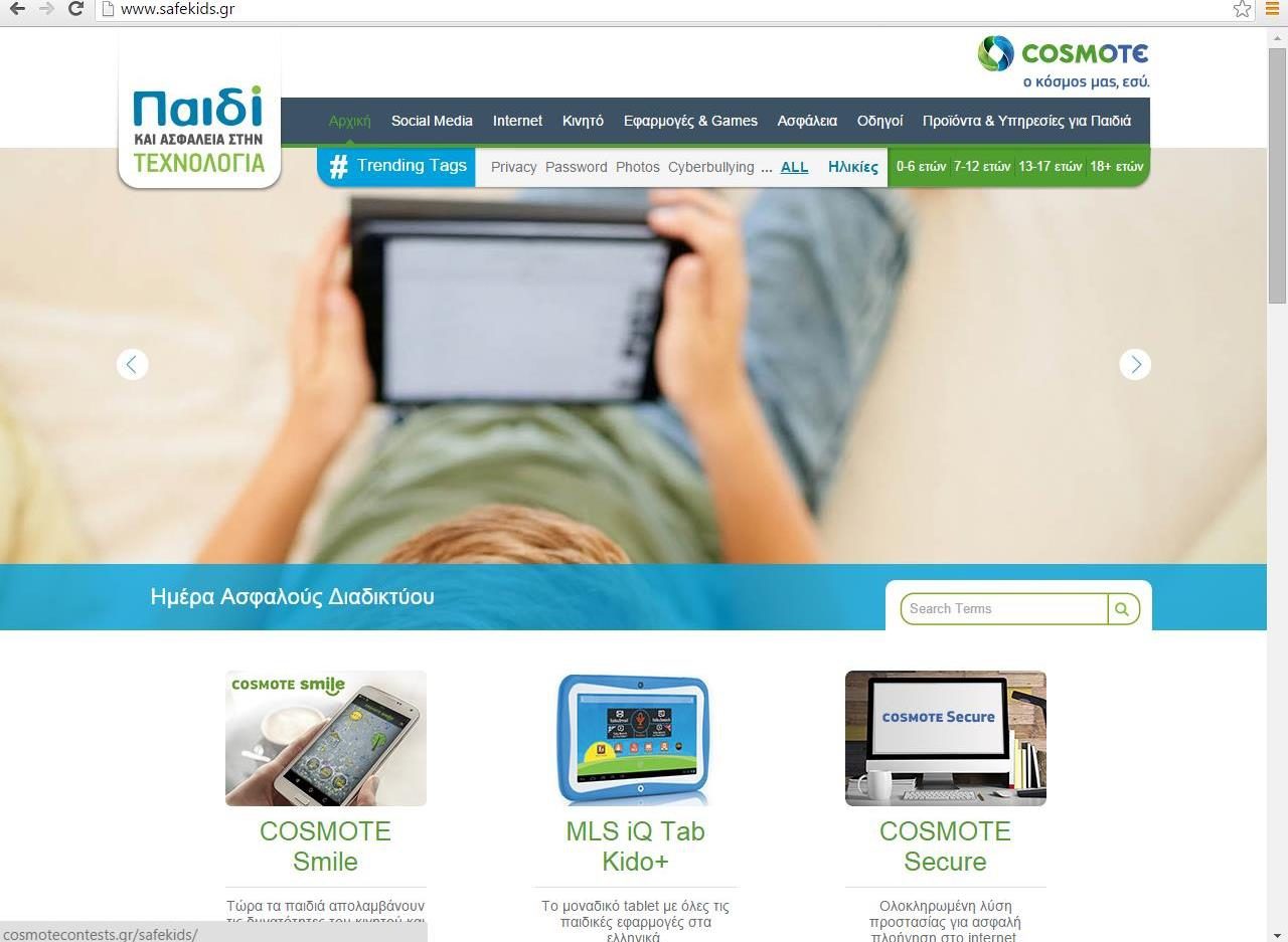 H εξειδικευμένη ιστοσελίδα “Safe Κids” από την COSMOTE παρέχει ενημέρωση για όλα τα θέματα που απασχολούν τους γονείς σχετικά με τη χρήση της τεχνολογίας από τα παιδιά και προτείνει ολοκληρωμένες λύσεις προστασίας σε κάθε περιβάλλον, από το κινητό μέχρι το tablet. Ανανεώνεται συνεχώς με ενδιαφέροντα θέματα για το διαδίκτυο, τα social media, τα games και τις εφαρμογές για σωστή χρήση της τεχνολογίας.