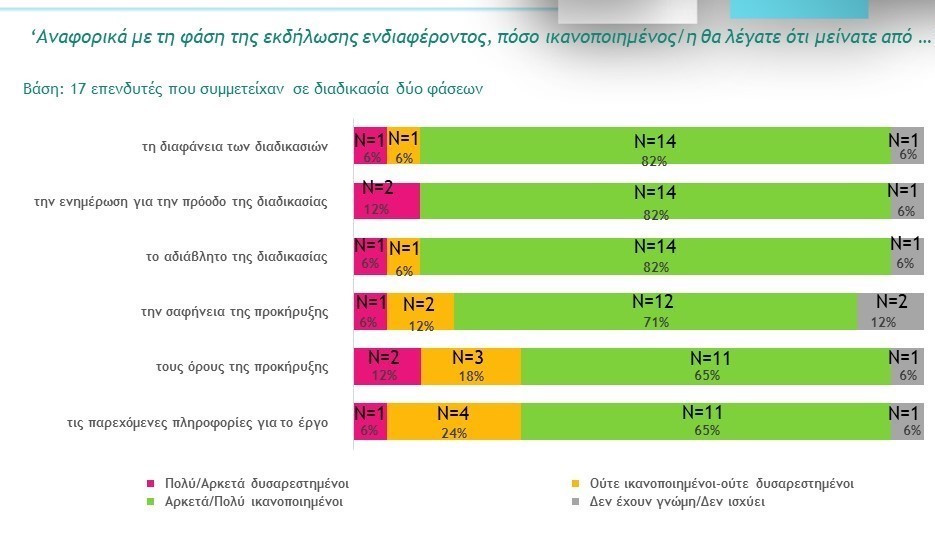 · Το αρχικό στάδιο της υλοποίησης μιας επένδυσης σε συνεργασία με το ΤΑΙΠΕΔ ήταν η εκδήλωση ενδιαφέροντος και οι αρχικές διερευνητικές επαφές για συλλογή πληροφοριών. Στο στάδιο αυτό προκύπτει μεγάλη ικανοποίηση από την κατανόηση των επενδυτικών αναγκών τους από τα στελέχη του ΤΑΙΠΕΔ με θετικό ισοζύγιο ικανοποίησης +83%.