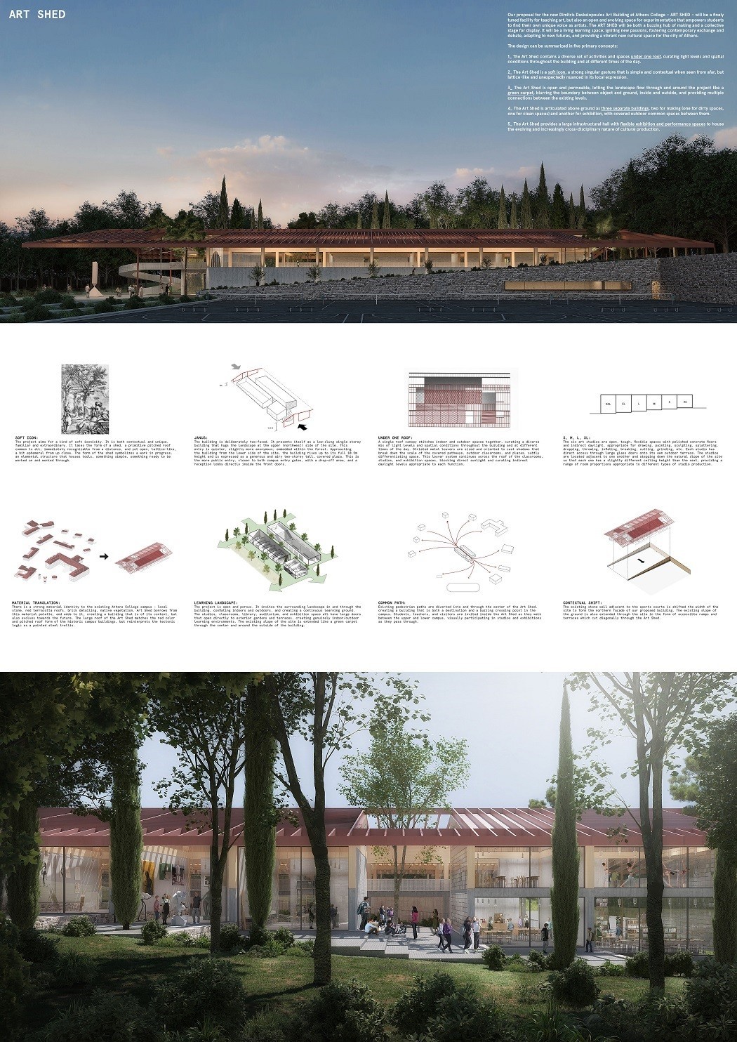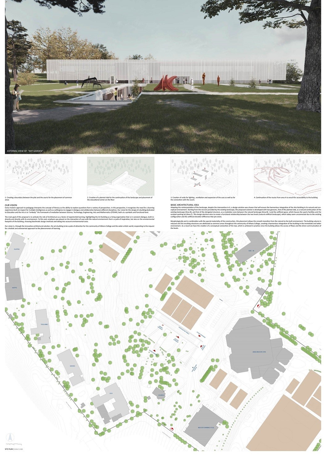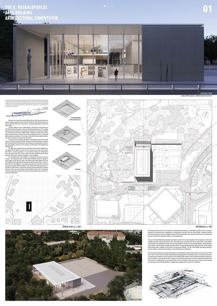 Άγι Μουρελάτο (Agis Mourelatos | Architects) και Γεώργιο Φατσέα σε συνεργασία με τη Μαρίνα Φιλιπποπούλου (σύμβουλος αρχιτέκτων), τον Αντώνιο Μουρελάτο (σύμβουλος αρχιτέκτων), την Ιωάννα Διαμαντή (φοιτήτρια αρχιτεκτονικής, σχεδιαστική ομάδα), τον Γιώργο Καρώνη (αρχιτέκτονας μηχανικός, σχεδιαστική ομάδα) και τον Αντώνη Τζώρτζη _ Studio Taf (rendering) Πάνο Παρθένιο, Άννα Καραγιάννη, Χρήστο Κύρου και Γεωργία Ίνα Παρθενίου σε συνεργασία με τη Βαλίνα Γεροπάντα (αστικός σχεδιασμός), τον Γιάννη Πετρουλάκη (αστικός σχεδιασμός), τον Κάρολο Χανικιάν (αρχιτέκτονας τοπίου), τον Μανώλη Οικονόμου (αρχιτέκτονας τοπίου), τη Φλώρα-Μαρία Μπουγιατιώτη (sustainable design), τον Αλέξανδρο Παπανδρέου (εκπαιδευτικός σύμβουλος), τον Παναγιώτη Κ. Παρθένιο (πολιτικός μηχανικός), τη Ραΐσσα Ανδρεοπούλου (αρχιτέκτονας τοπίου), την Κωνσταντίνα Κερασοβίτη (αρχιτέκτονας, WELL AP), τον Γιάννη Δαχής (αρχιτέκτονας), την Κυριακή Φόρτη (αρχιτέκτονας), τη Δήμητρα Νύκταρη (φοιτήτρια αρχιτεκτονικής), την Γεωργία Λύτσικα (φοιτήτρια αρχιτεκτονικής) και τη Λαϊδα – Ιωάννα Μαργιωρή (φοιτήτρια αρχιτεκτονικής)