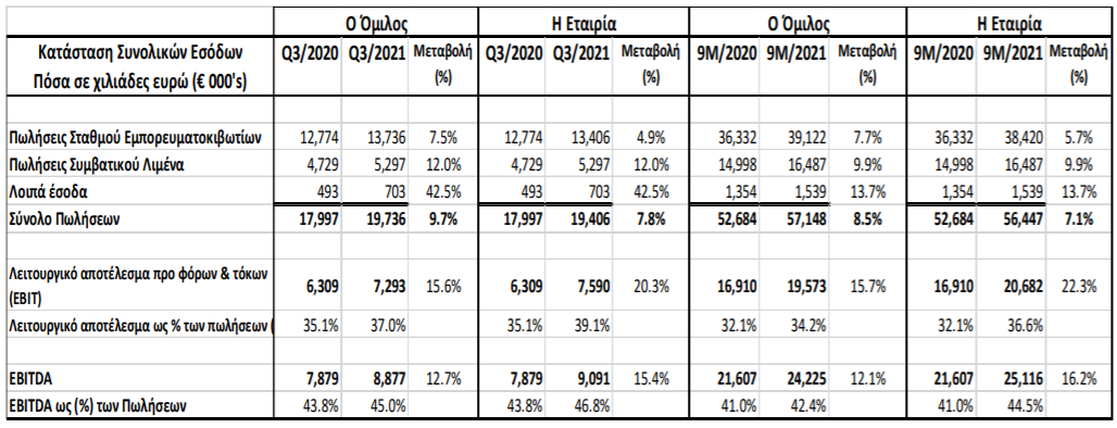 Τα συνολικά ενοποιημένα έσοδα για το τρίτο τρίμηνο αυξήθηκαν κατά 9,7%, από ~ € 18 εκατ. το τρίτο τρίμηνο (Q3/2020), σε ~ € 19,7 εκατ. το Q3/2021, δεδομένου ότι η θυγατρική “ThPA Sofia” δεν παρουσίασε έσοδα εντός του 2020, ενώ τα συνολικά έσοδά της για το Q3/2021 του 2021 ανήλθαν σε € 330χιλ., περιλαμβανόμενα στα ανωτέρω ενοποιημένα έσοδα. Για την περίοδο του 9μήνου καταγράφηκε συνολική αύξηση 8,5%, από € 52,7εκατ. το 9Μ/2020, σε € 57,1εκατ. το 9Μ/2021, συμπεριλαμβανομένων των συνολικών εσόδων της θυγατρικής «ThPA Sofia» για το 9Μ/2021 τα οποία ξεπέρασαν τις € 700χιλ.