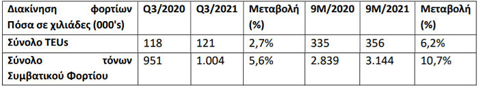 Αναφορικά με το Σταθμό Συμβατικού Φορτίου, η διακίνηση για το Q3/2021 αυξήθηκε κατά 5,6%, από 951 χιλ. τόνους το Q3/2020, σε 1.004 χιλ. τόνους το Q3/2021. Κατά την περίοδο του 9μήνου, οι όγκοι αυξήθηκαν κατά 10,7%, από 2.839 χιλ. τόνους το 9Μ/2020, σε 3.144 χιλ. τόνους το 9Μ/2021.