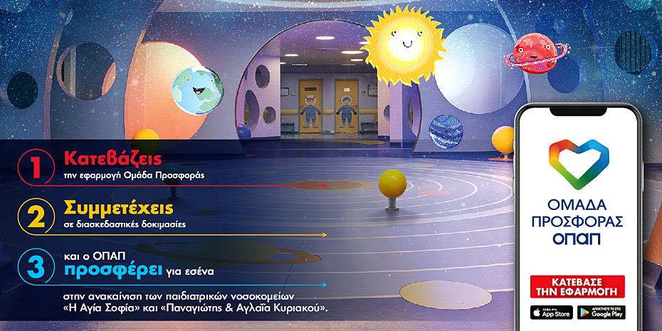 Στην τελική ευθεία μπαίνει ο φετινός αγώνας της «Ομάδας Προσφοράς ΟΠΑΠ» για την ανακαίνιση των παιδιατρικών νοσοκομείων. Όπως αναφέρεται σε σχετική ανακοίνωση, έως την ερχόμενη Κυριακή 14 Νοεμβρίου, με κάθε νέο download της εφαρμογής «Ομάδα Προσφοράς» ο ΟΠΑΠ αυξάνει το ποσό που θα προσφέρει στο έργο της ανακαίνισης των νοσοκομείων «Η Αγία Σοφία» και «Παναγιώτης και Αγλαΐα Κυριακού».