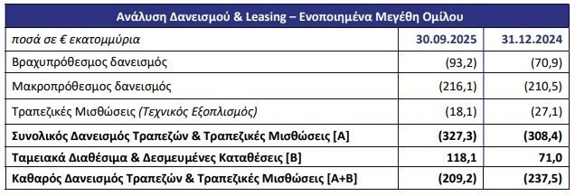 Ο καθαρός τραπεζικός δανεισμός του Ομίλου (συμπεριλαμβανομένων των υποχρεώσεων από leasing εξοπλισμού) μειώθηκε σημαντικά στη διάρκεια του εννεαμήνου του τρέχοντος έτους, ανερχόμενος σε €209,2 εκατομμύρια την 30.09.2025 από €237,5 εκατομμύρια την 31.12.2024. Ο δείκτης μόχλευσης (Καθαρός Δανεισμός / EBITDA) μειώθηκε περαιτέρω, φτάνοντας το 1,60x με βάση το EBITDA των τελευταίων 12 μηνών. Η βελτίωση του δείκτη οφείλεται στη συνεχιζόμενη ενίσχυση του EBITDA και τον περιορισμό του καθαρού δανεισμού, παρά την αύξηση του κύκλου εργασιών.