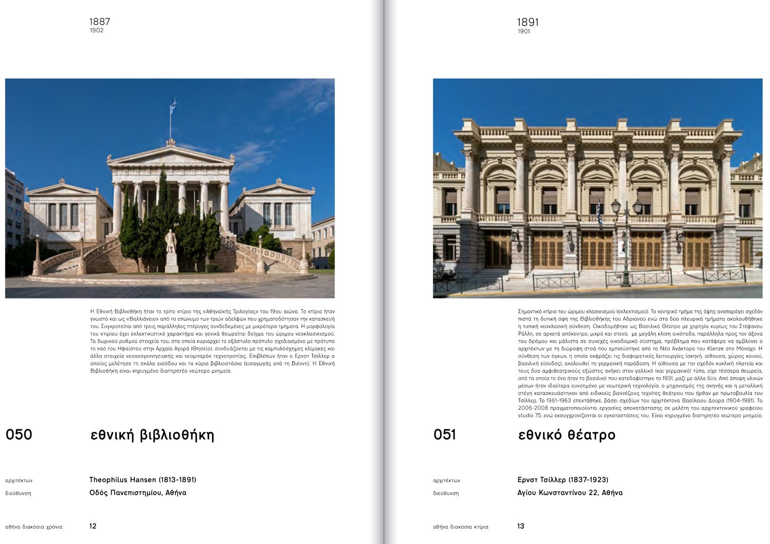 Η παρουσίαση του κάθε κτιρίου καταλαμβάνει μία σελίδα και περιλαμβάνει φωτογραφία, βασικές πληροφορίες, καθώς και μία σύντομη περιγραφή του, ενώ στο σύνολό τους τα κτίρια έχουν οργανωθεί σε πέντε χρονολογικές περιόδους για να διευκολύνεται ο αναγνώστης να τοποθετεί κάθε κτίριο στον αντίστοιχο ιστορικό του χρόνο. Το λεύκωμα ξεκινάει με την περίοδο της συγκρότησης του πρώτου αθηναϊκού κλασικισμού και συνεχίζεται με τις περιόδους του όψιμου κλασικισμού και του Μεσοπολέμου, όπου και αρχίζει να επικρατεί το μοντέρνο κίνημα στην αρχιτεκτονική. Ακολουθούν δύο μεταπολεμικές περίοδοι, με την τελευταία να διαρκεί έως σήμερα.