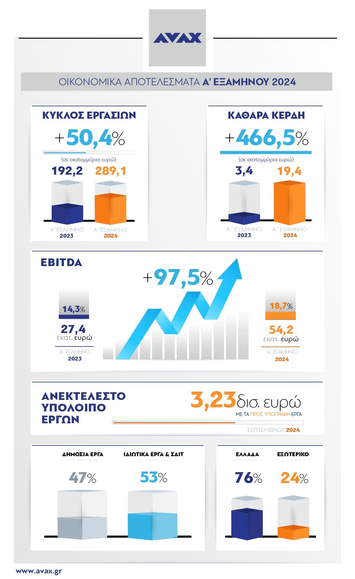 Σημαντική αύξηση του κύκλου εργασιών, των καθαρών κερδών, του EBITDA και περαιτέρω μείωση του καθαρού δανεισμού παρουσιάζει ο Όμιλος ΑΒΑΞ, ανακοινώνοντας τα οικονομικά αποτελέσματα του α’ 6μήνου του 2024, που πιστοποιούν την ηγετική του παρουσία και τις προοπτικές του στα μεγάλα έργα υποδομών.