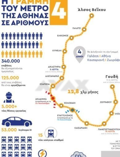 Σε 8 χρόνια, σύμφωνα με το χρονοδιάγραμμα του έργου, θα κατασκευαστούν σε μια γραμμή μήκους 12,8 χιλιομέτρων, η οποία θα εκτείνεται σε 4 δήμους, 15 νέοι υπόγειοι σταθμοί σε Άλσος Βεΐκου, Γαλάτσι, Ελικώνος, Κυψέλη, Δικαστήρια, Αλεξάνδρας, Εξάρχεια, Ακαδημία, Κολωνάκι, Ευαγγελισμός, Καισαριανή, Πανεπιστημιούπολη, Ζωγράφου, Ιλίσια και Γουδή.