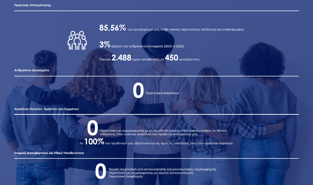 Ο Όμιλος προσφέρει ένα σταθερό, δίκαιο και συμπεριληπτικό εργασιακό περιβάλλον για όλους τους εργαζόμενους του, με σεβασμό στη διαφορετικότητα, δυνατότητες ανάπτυξης και υψηλά πρότυπα εργασιακής υγείας και ασφάλειας. Κατά το 2023, αύξησε το ποσοστό των εργαζομένων κατά 13.63%, κρατώντας σε χαμηλά επίπεδα το ποσοστό εργαζομένων μερικής απασχόλησης (3.55%). Συνέχισε να επενδύει στην ανάπτυξη τεχνικών και προσωπικών δεξιοτήτων του ανθρώπινου δυναμικού του, καθώς και στην εφαρμογή πρακτικών ευαισθητοποίησης και εκπαίδευσης των εργαζομένων, με το σύνολο των ωρών εκπαίδευσης να φτάνει στις 2.488 ώρες.