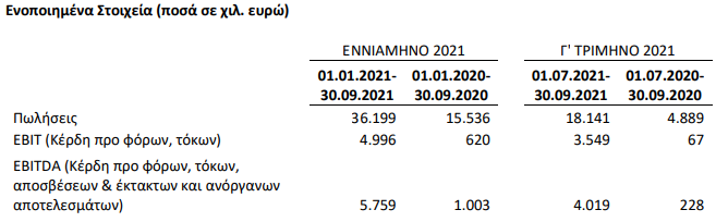 Παρακάτω παρουσιάζονται οι ενοποιημένες οικονομικές επιδόσεις (pro forma) για την περίοδο 01.01 – 30.09.2021 όπως θα διαμορφώνονταν αν η αύξηση μετοχικού κεφαλαίου είχε πραγματοποιηθεί στην έναρξη της χρήσης δηλαδή την 01.01.2021 καθώς και τα αποτελέσματα της περσινής περιόδου 01.01 – 30.09.2020 στα οποία για σκοπούς συγκρισιμότητας έχουν συμπεριληφθεί και τα οικονομικά αποτελέσματα των εισφερόμενων εταιρειών.