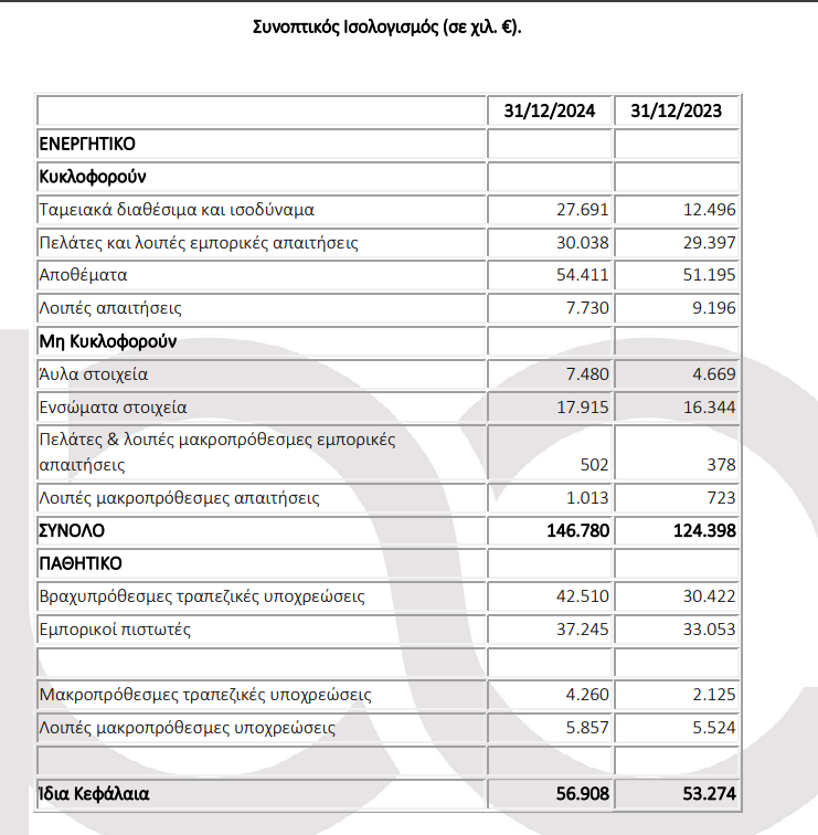 Τα ίδια κεφάλαια αυξήθηκαν στα €56,9 εκατ. από €53,3 εκατ. το 2023. Ο δείκτης φερεγγυότητας του Ομίλου (καθαρή θέση ως % του συνόλου του ενεργητικού χωρίς τα μετρητά και ισοδύναμα) στις 31.12.2024 ήταν 47,8%.