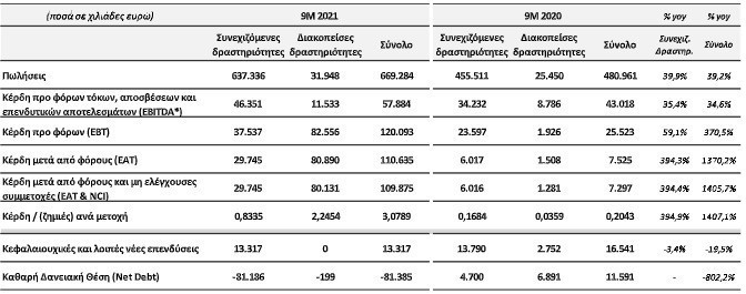 Στο εννεάμηνο του 2021 οι πωλήσεις της εταιρείας ήταν ελαφρώς αυξημένες (+1,3%) καθώς και η προ φόρων κερδοφορία (+17%) σε σχέση με την αντίστοιχη περυσινή χρήση.
