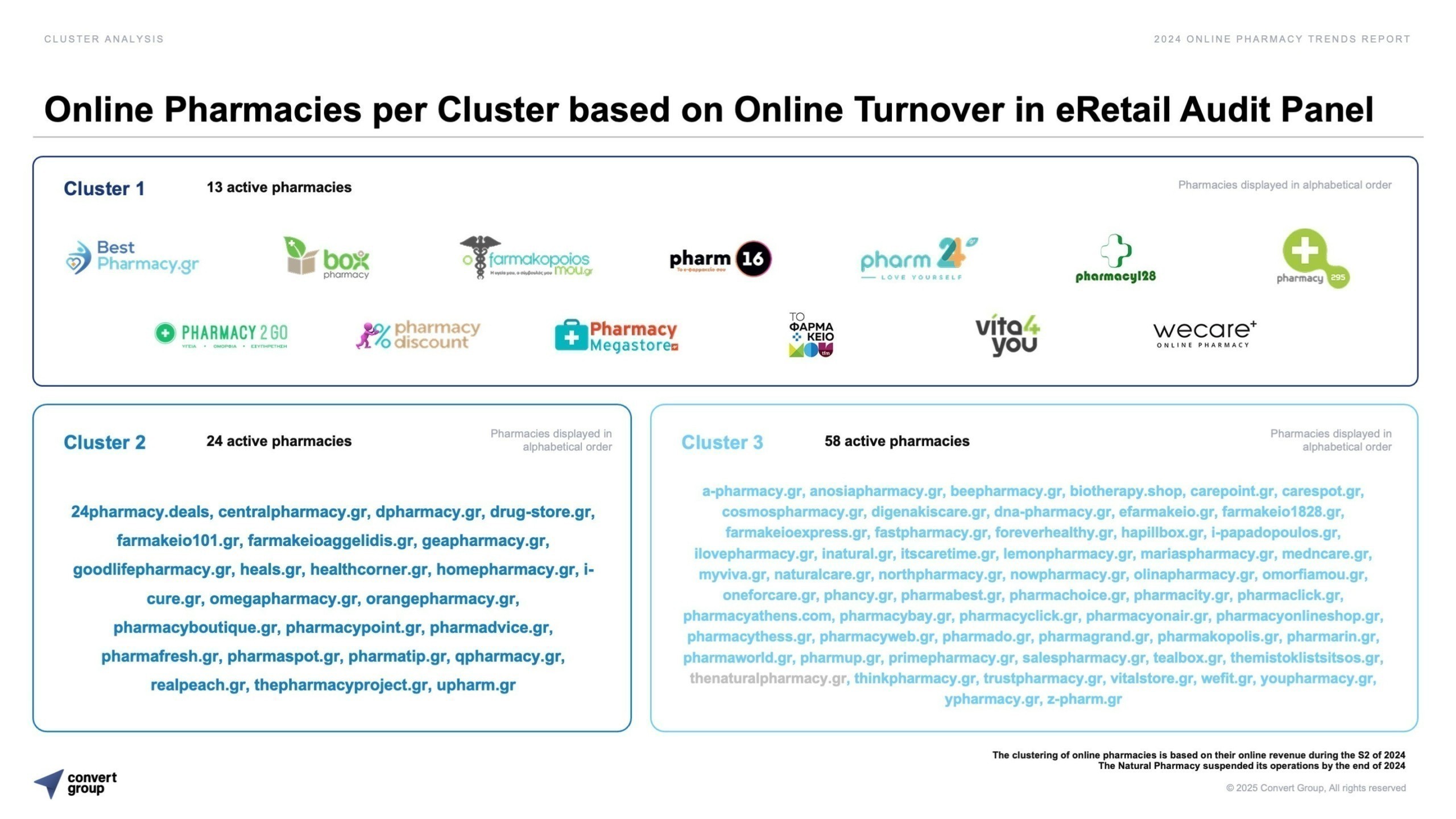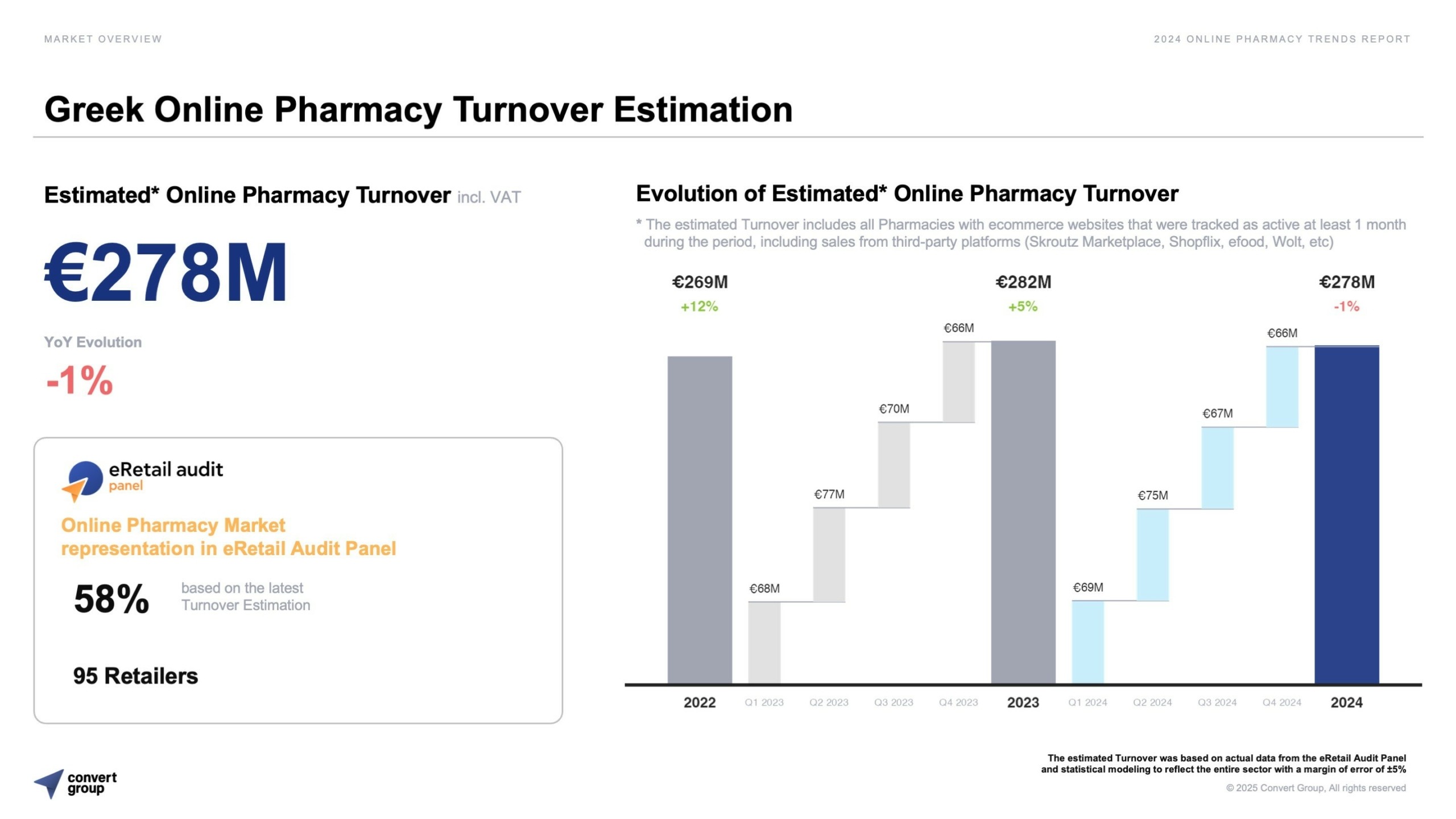 Τα συγκεκριμένα στοιχεία της ετήσιας έρευνας της Convert Group αντλούνται από δείγμα 95 online φαρμακείων, με την συμμετοχή 13 από τους 14 μεγαλύτερους παίκτες της αγοράς αλλά και των στοιχείων του skroutz, με συνολική αντιπροσώπευση αγοράς στο 90%.