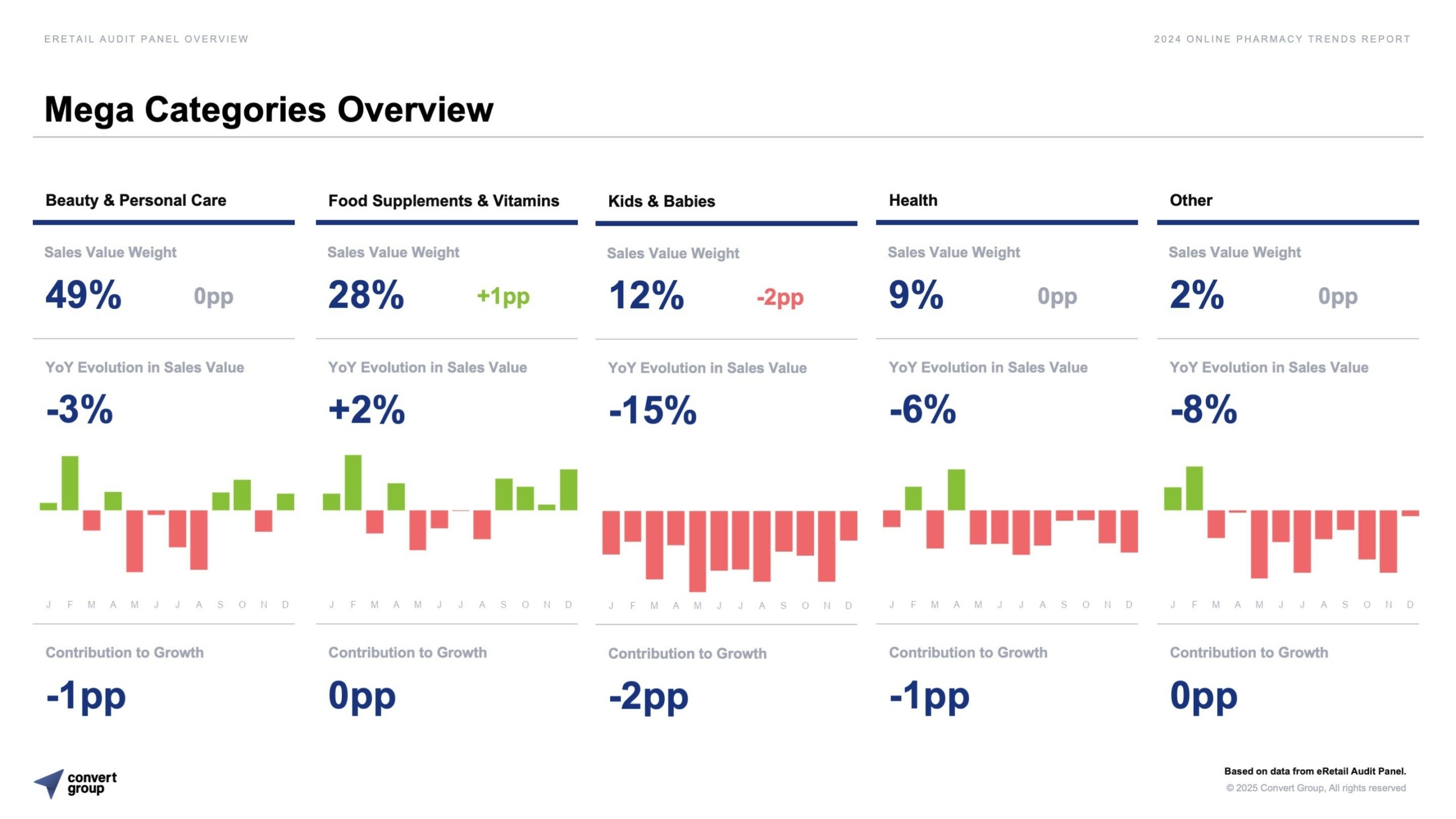 Η κλάδος του online φαρμακείου διαχρονικά γνώριζε διψήφια ποσοστά ανάπτυξης, εξαιτίας των μεγάλων εκπτώσεων σε σχέση με το φυσικό σημείο, την ευκολία εξυπηρέτησης και τη μεγαλύτερη ποικιλία σε σχέση με το φαρμακείο της γειτονιάς. Η απότομη αλλαγή στην αγορά ξεκίνησε το Σεπτέμβριο του 2023 λόγω της εναρμόνισης με τις οδηγίες του Υπουργείου Ανάπτυξης για το τρόπο αναγραφής και επικοινωνίας των εκπτώσεων σε φυσικά και ηλεκτρονικά καταστήματα, η οποία επηρέασε την αντίληψη που είχε το ευρύ κοινό για τον εκπτωτικό προσανατολισμό των online φαρμακείων. Επιπρόσθετα, η σημαντική μείωση των γεννήσεων που καταγράφεται τα τελευταία 2 χρόνια σε σχέση με προηγούμενα έτη οδήγησε σε μειωμένες αγορές της κατηγορίας βρεφικών ειδών το 2024 κατά 15% σε αξία, δημιουργώντας ένα ακόμα πονοκέφαλο σε φαρμακοποιούς και εταιρείες που δραστηριοποιούνται στο ηλεκτρονικό εμπόριο.