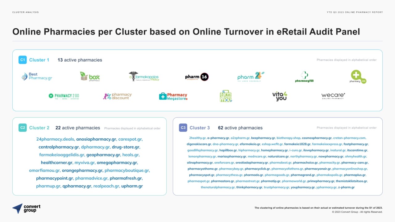 Το 9μηνιαίο report της Convert Group για τον κλάδο του Online Φαρμακείου δημοσιεύτηκε στη διεύθυνση https://convertgroup.com/resources/reports. Η Convert Group δραστηριοποιείται στον κλάδο των Data & Analytics με καινοτομικά έργα σε Ευρώπη, Λατινική Αμερική και Μέση Ανατολή. Βραβεύεται για 6 συνεχόμενες χρονιές ως ένα από τα 25 καλύτερα εργασιακά περιβάλλοντα της Ελλάδας και ένα από τα καλύτερα εργασιακά περιβάλλοντα της Ευρώπης για το 2021 και απασχολεί 65 άτομα επιστημονικό προσωπικό, σε ρόλους engineers, data scientists, και analysts.