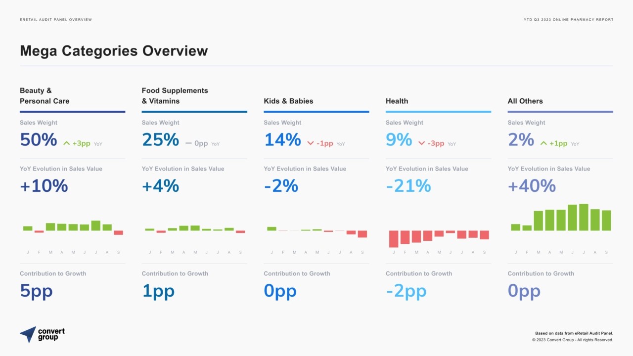 Τα στοιχεία αυτά μαζί με πολλά ακόμη πολύτιμα ευρήματα περιλαμβάνονται στο 9μηνιαίο report που δημοσίευσε σήμερα η Convert Group μέσω της πλατφόρμας της eRetail Audit. H καινοτομική πλατφόρμα της εταιρείας, επιτρέπει σε προμηθευτές και εμπόρους προϊόντων μέσω ηλεκτρονικού εμπορίου, να έχουν καθημερινή πρόσβαση σε εμπορικά, marketing και τεχνολογικά δεδομένα που διαδραματίζουν καθοριστικό ρόλο στη στρατηγική τους στο ψηφιακό ράφι. Τα συγκεκριμένα στοιχεία αντλούνται από 97 online φαρμακεία, με την συμμετοχή 13 από τους 15 μεγαλύτερους παίκτες της αγοράς [Πίνακας 3].