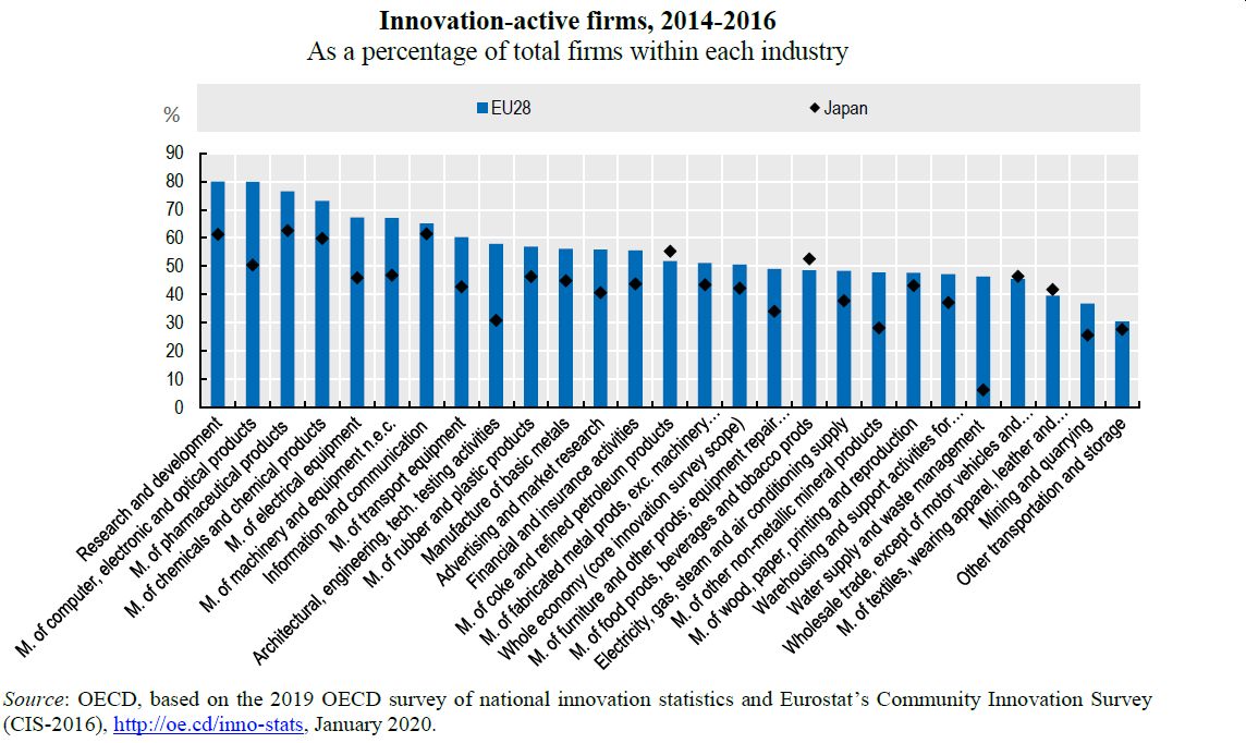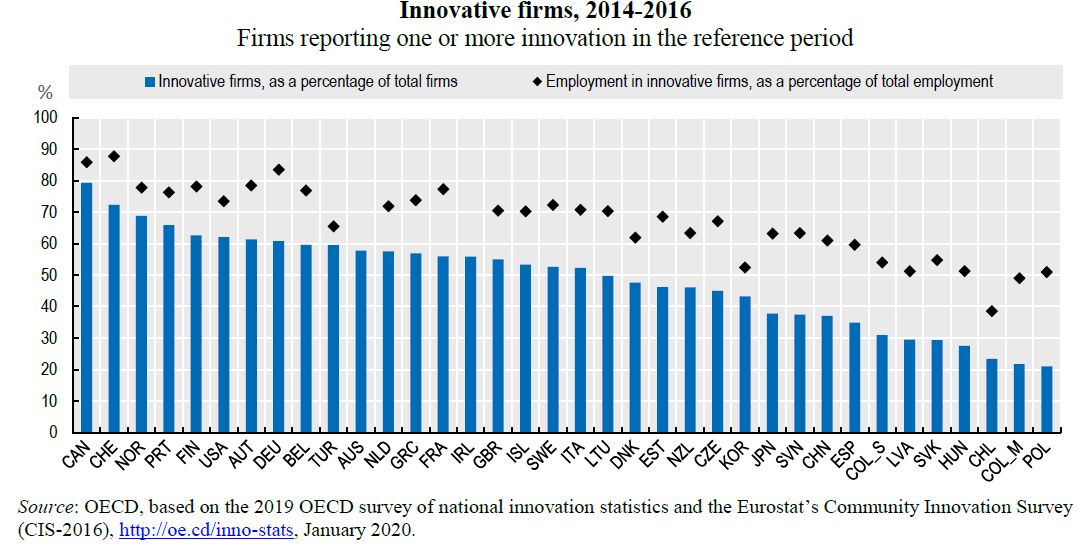 - Οι δραστηριότητες και τα αποτελέσματα της καινοτομίας εμφανίζονται να έχουν ιδιαίτερα υψηλό βαθμό συγκέντρωσης, καθώς οι μεγαλύτερες επιχειρήσεις τείνουν να έχουν καλύτερες επιδόσεις. Κατά μέσο όρο, στις 39 χώρες του ΟΟΣΑ, το 53% των επιχειρήσεων εισήγαγαν ένα νέο προϊόν ή μια νέα επιχειρησιακή διαδικασία. Αυτές οι επιχειρήσεις απασχολούν το 70% των εργαζομένων των επιχειρήσεων.