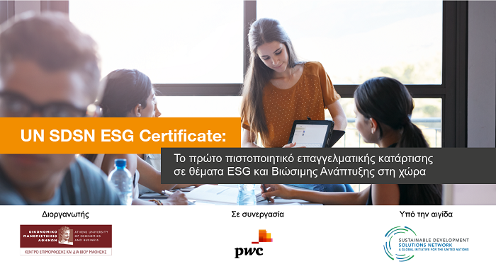 Το UN SDSN ESG, το πρώτο πρόγραμμα επαγγελματικής κατάρτισης στη χώρα σε θέματα ESG και βιώσιμης ανάπτυξης, ξεκινάει τη λειτουργία του από το Κέντρο Δια Βίου Μάθησης (ΚΕΔΙΒΙΜ) του Οικονομικού Πανεπιστημίου Αθηνών (ΟΠΑ), σε συνεργασία με την PwC Ελλάδας, σύμφωνα με σχετική ανακοίνωση.