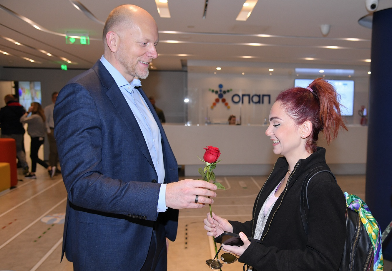 Μία ευχάριστη έκπληξη περίμενε, χθες, τις εργαζόμενες στον ΟΠΑΠ, με αφορμή την Παγκόσμια Ημέρα της Γυναίκας. Από νωρίς το πρωί, ο Διευθύνων Σύμβουλος, Γιαν Κάρας, και ο Αναπληρωτής Διευθύνων Σύμβουλος, Οδυσσέας Χριστοφόρου, υποδέχονταν τις εργαζόμενες στην είσοδο των κεντρικών γραφείων στη Λ. Αθηνών, μοιράζοντάς τους τριαντάφυλλα και ευχές για την ημέρα.