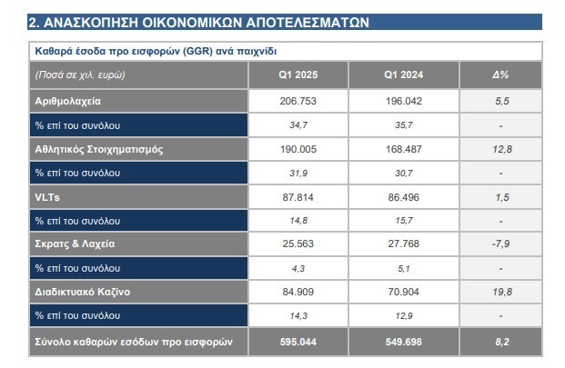 Τα καθαρά έσοδα προ εισφορών (GGR) το α’ τρίμηνο 2025 αυξήθηκαν κατά 8,2% σε ετήσια βάση και διαμορφώθηκαν στα €595,0εκ. έναντι €549,7εκ. το α΄ τρίμηνο 2024, κυρίως λόγω της ισχυρής ανάπτυξης στον αθλητικό στοιχηματισμό, σε συνδυασμό με το αυξημένο περιθώριο κέρδους, καθώς και της ισχυρής επίδοσης του Τζόκερ, ευνοημένο από τα συνεχόμενα τζάκποτ και το μεγαλύτερο έπαθλο στην ιστορία του παιχνιδιού που δόθηκε τον Ιανουάριο.