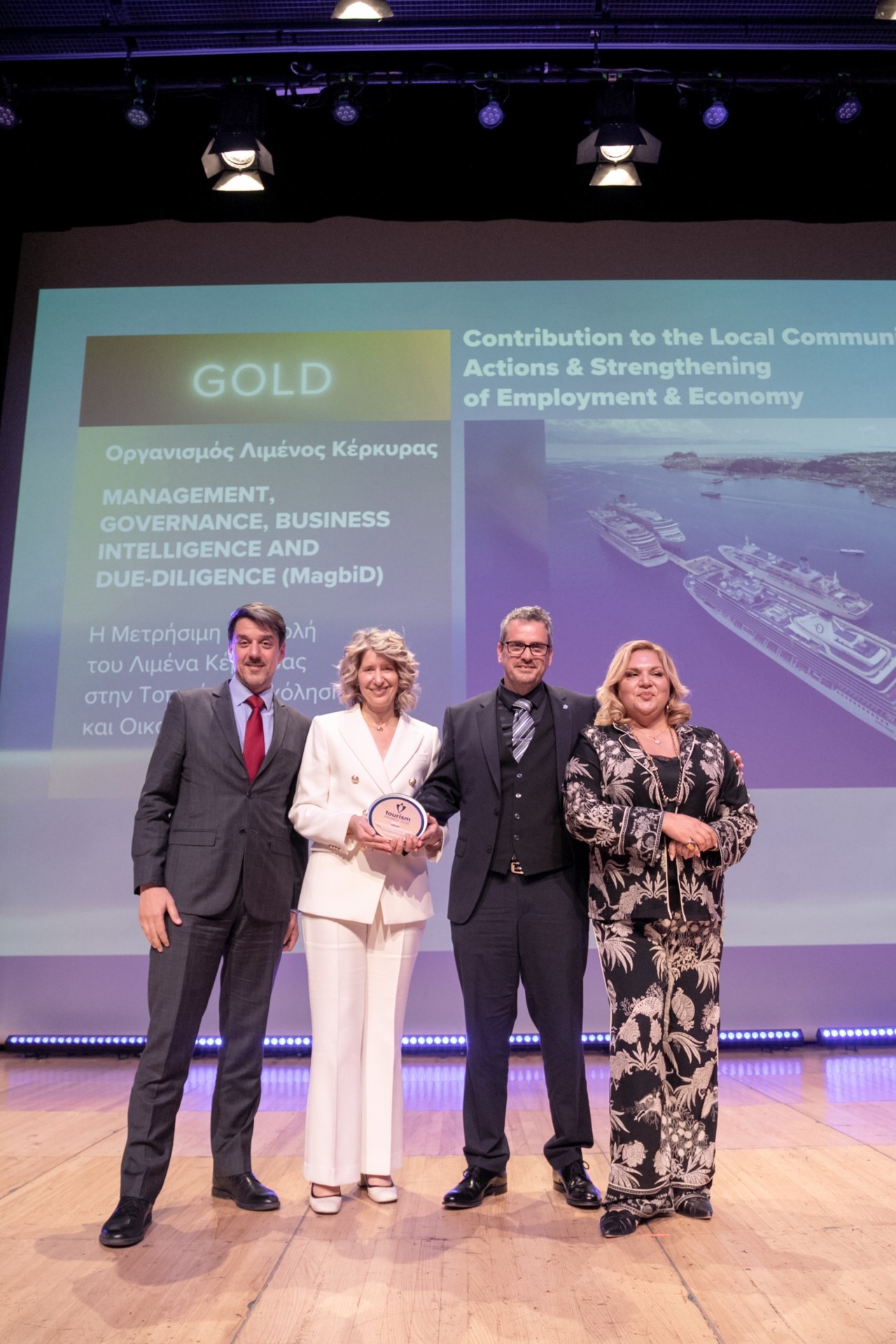 Παράλληλα, ο Οργανισμός Λιμένος Κέρκυρας Α.Ε. τιμήθηκε με Χρυσό Βραβείο στην κατηγορία «Contribution to Local Community – Actions Strengthening of Employment & Economy», για τη μετρήσιμη συμβολή του στην τοπική οικονομία και την απασχόληση. Η υποψηφιότητα βασίστηκε σε ολοκληρωμένη αποτίμηση των επιπτώσεων της λιμενικής δραστηριότητας, μέσω πρωτογενούς έρευνας και οικονομικών υποδειγμάτων εισροών–εκροών, αποτυπώνοντας τις άμεσες, έμμεσες και προκαλούμενες επιδράσεις στον τοπικό οικονομικό ιστό. Η ανάλυση ανέδειξε τη σημαντική ενίσχυση της απασχόλησης και των εισοδημάτων, καθώς και τη διάχυση οφελών σε κρίσιμους τομείς όπως ο τουρισμός, το εμπόριο και οι υπηρεσίες, επιβεβαιώνοντας τον ρόλο του λιμένα ως βασικού πυλώνα οικονομικής και κοινωνικής συνοχής.