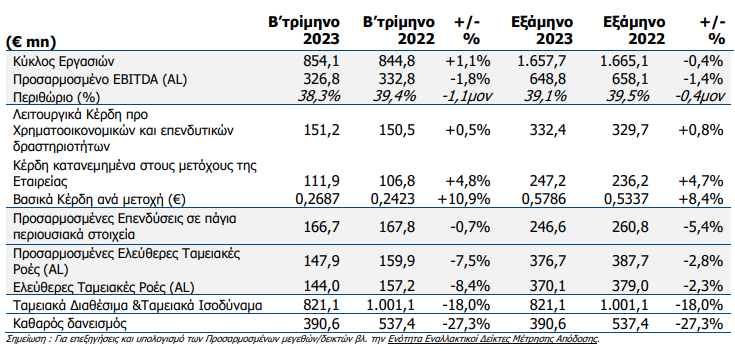 Η προσαρμοσμένη κερδοφορία EBITDA (AL) του Ομίλου μειώθηκε κατά 1,8% στα €326,8 εκατ., με το περιθώριο να διαμορφώνεται σε 38,3%. Στην Ελλάδα, η προσαρμοσμένη κερδοφορία EBITDA (AL) σημείωσε αύξηση 0,9%, στα €322,0 εκατ., με ισχυρό περιθώριο EBITDA 40,9%.