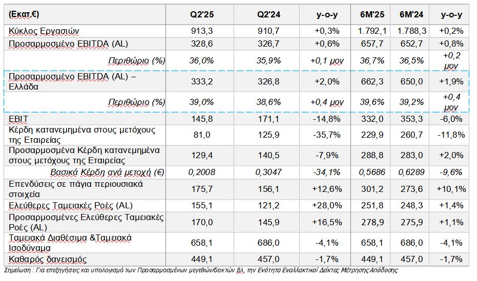Το προσαρμοσμένο EBITDA (AL) του Ομίλου ανήλθε σε €328,6 εκατ., αυξημένο κατά 0,6%, αντικατοπτρίζοντας την ανάπτυξη κατά 2,0% στην Ελλάδα.