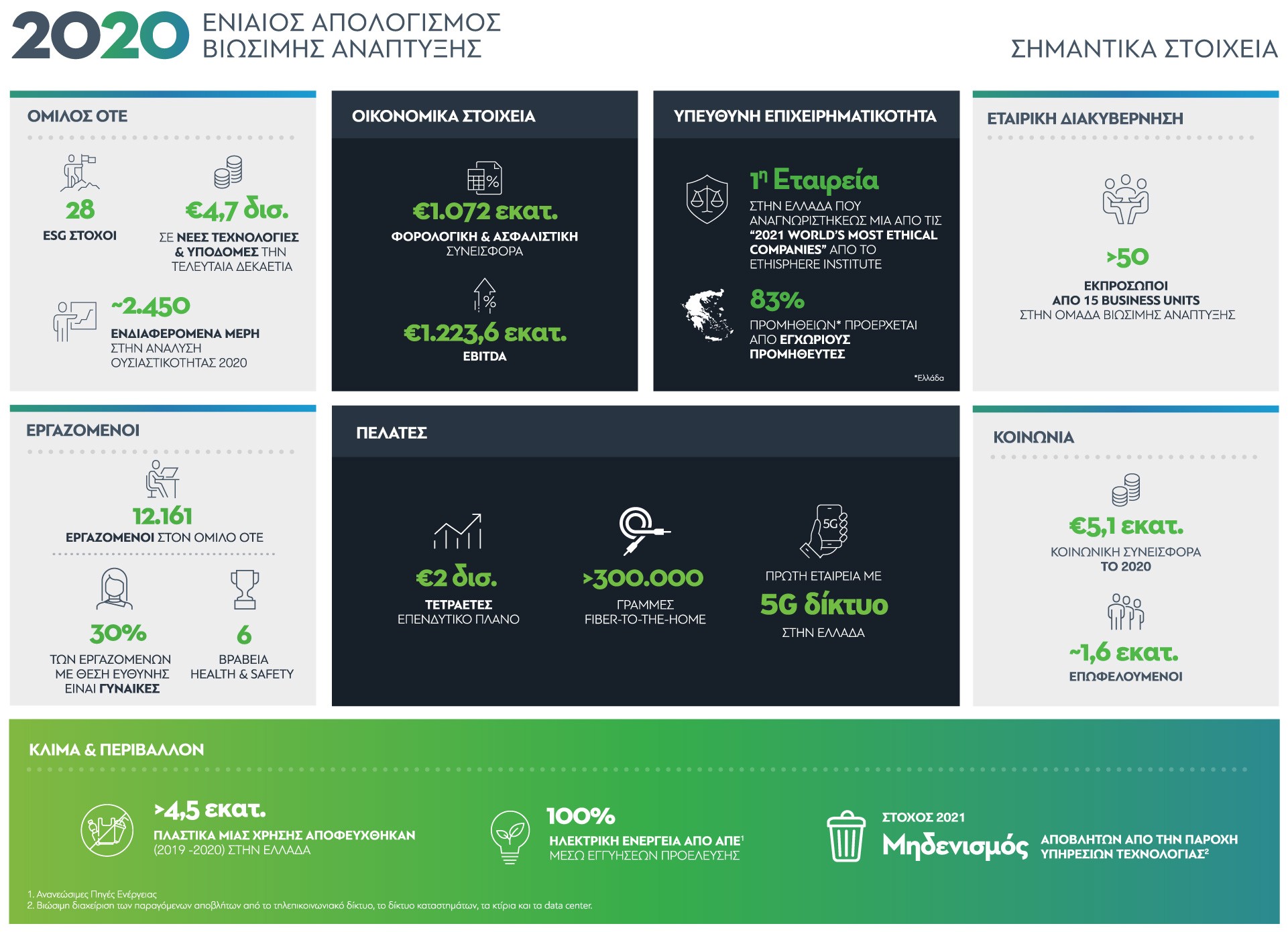 Σημαντικά χρηματοοικονομικά αλλά και μη στοιχεία, όπως η πληροφόρηση ESG για τη βιωσιμότητα του Ομίλου ΟΤΕ από τις δραστηριότητές του σε όλους τους τομείς, αποτυπώνονται στον Ενιαίο Απολογισμό Βιώσιμης Ανάπτυξης 2020. Ο 16ος Απολογισμός Βιώσιμης Ανάπτυξης του Ομίλου ΟΤΕ καταγράφει τη συνεισφορά του Ομίλου ΟΤΕ στη δημιουργία ενός κόσμου καλύτερου για όλους μέσω της τεχνολογίας, παρουσιάζοντας την μακροπρόθεσμη αξία που παράγει για την κοινωνία, την οικονομία και το περιβάλλον.