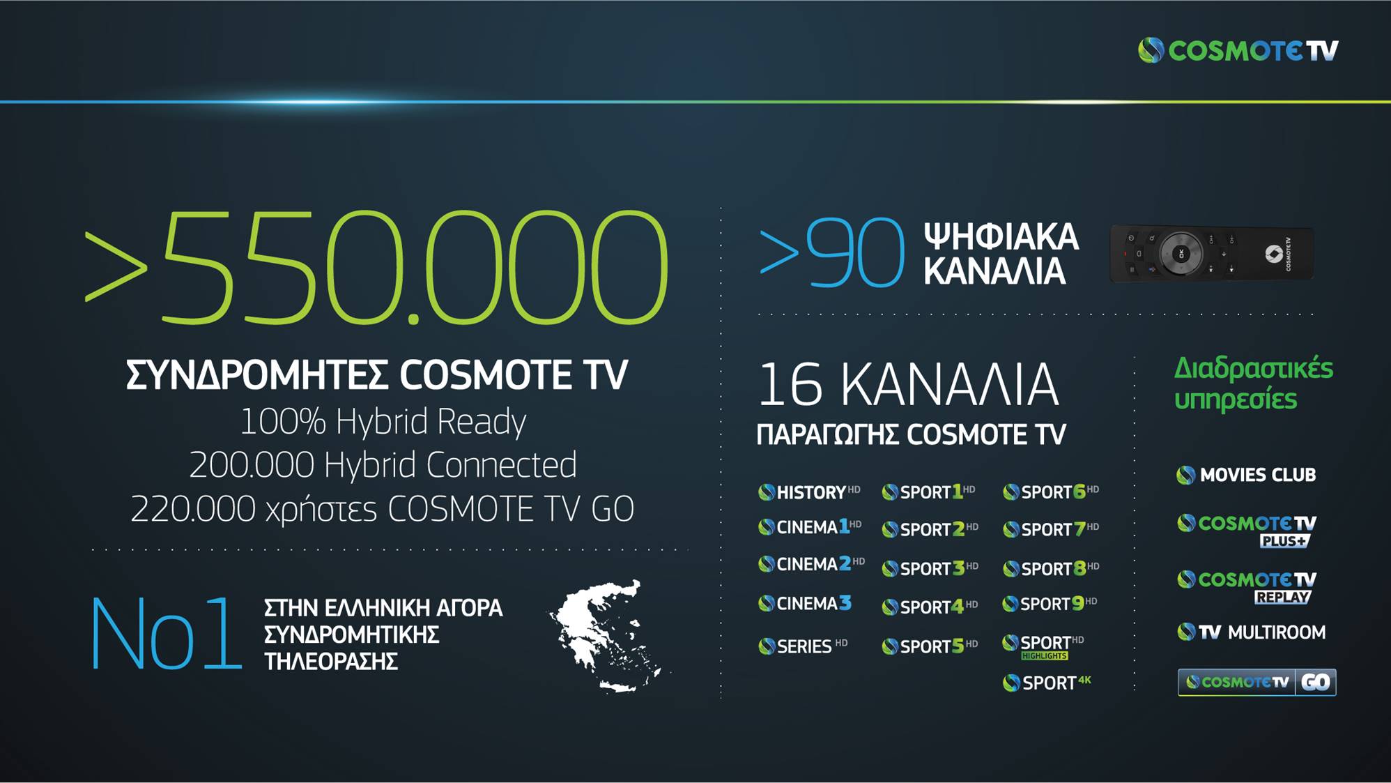 Oι επιτελείς του ομίλου ανέφεραν ότι η Cosmote TV, η οποία ξεκίνησε πριν από επτά χρόνια, έχει περί τους 550.000 πελάτες από το σύνολο του 1,05 εκατ. συνδρομητών αυτή την στιγμή συνολικά στην αγορά συνδρομητικής τηλεόρασης, νούμερο μάλιστα το οποίο βρίσκεται κάτω από τα ιστορικά υψηλά όπου είχε φθάσει η αγορά. Από τους συνδρομητές της εταιρείας οι 200.000 έχουν υβριδικό κωδικοποιητή με τη δυνατότητα σύνδεσης εξωτερικού σκληρού δίσκου (σε απλό αποκωδικοποιητή) για εγγραφή προγραμμάτων και σειρών, εγγραφή βάσει χρονικής διάρκειας κ.α., ενώ σε 220 χιλ. υπολογίζονται οι χρήστες Cosmote TV Go.