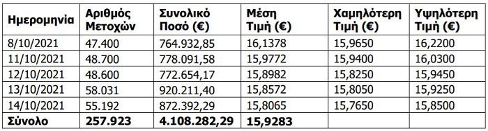 Μετά και τις προαναφερόμενες αγορές, η Εταιρεία κατέχει 5.547.040 ίδιες μετοχές, ποσοστό 1,214% του συνόλου των μετοχών της Εταιρείας.