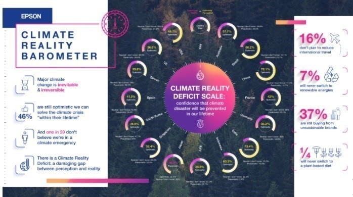 Πενήντα ημέρες πριν από την έναρξη της διάσκεψης COP26 στο Ηνωμένο Βασίλειο τον Νοέμβριο, η Epson ανακοίνωσε τα αποτελέσματα του Βαρομέτρου Κλιματικής Πραγματικότητας. Η έρευνα της Epson αποκαλύπτει ένα δυνητικά επιζήμιο χάσμα μεταξύ της κλιματικής πραγματικότητας και της κατανόησης των καταστροφικών συνεπειών της από τους ανθρώπους.