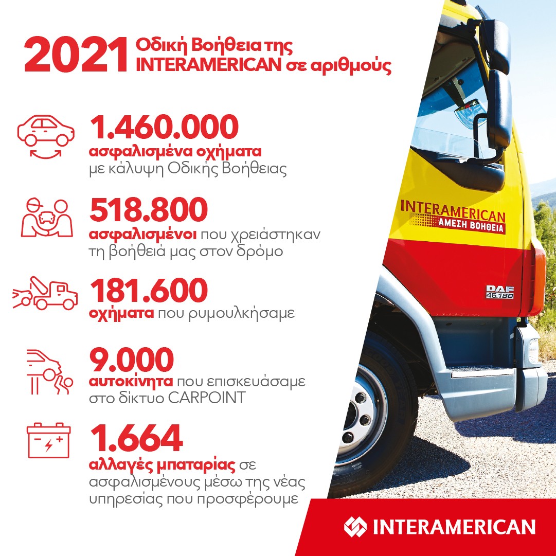 Ενδεικτικά, το 2021 η Οδική Βοήθεια της Interamerican υποστήριξε 518.800 ασφαλισμένους, οι οποίοι χρειάστηκαν βοήθεια στον δρόμο. Ρυμούλκησε 181.600 οχήματα, επισκεύασε πάνω από 9.000 αυτοκίνητα στο δίκτυο CAR POINT σε όλη την Ελλάδα και στο κεντρικό της κατάστημα στην Αθήνα και προσέφερε τη νέα υπηρεσία αλλαγής μπαταρίας σε 1.664 ασφαλισμένους, στο σημείο ακινητοποίησης του οχήματός τους.