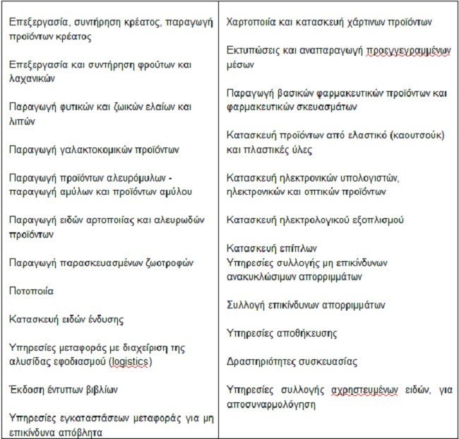Στο πλαίσιο της δράσης “Έξυπνη μεταποίηση” επιδοτούνται μικρομεσαίες μεταποιητικές επιχειρήσεις οι οποίες ασχολούνται με τις παρακάτω ενδεικτικές μεταποιητικές δραστηριότητες: