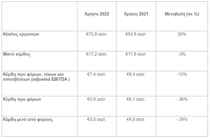 Τα κέρδη προ φόρων, τόκων και αποσβέσεων (adjusted EBITDA) λόγω των προαναφερόμενων παραγόντων ανήλθαν σε 7,4 εκ. ευρώ έναντι 8,4 εκ. ευρώ το 2021 μειωμένα κατά 12%. Για τους ίδιους λόγους, η κερδοφορία (προ φόρων) της Εταιρείας ανήλθε σε 3,9 εκατ. ευρώ έναντι 6,1 εκατ. ευρώ το 2021, ενώ η κερδοφορία μετά από φόρους ανήλθε σε 3,0 εκατ. ευρώ έναντι 4,9 εκατ. το προηγούμενο έτος.