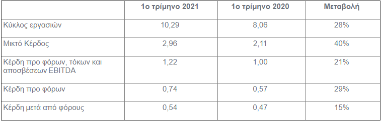 Το μικτό κέρδος, επηρεαζόμενο θετικά από την ανάπτυξη πωλήσεων και τη μείωση του παραγωγικού κόστους, συνέπεια των επενδύσεων που υλοποιεί η εταιρεία, ανήλθε σε 2,96 εκατ. ευρώ έναντι 2,11 εκατ. την αντίστοιχη περίοδο του 2020, βελτιωμένο κατά 40%. Το μικτό περιθώριο κέρδους εμφάνισε βελτίωση και ανήλθε σε 29% έναντι 26% το πρώτο τρίμηνο του 2020.